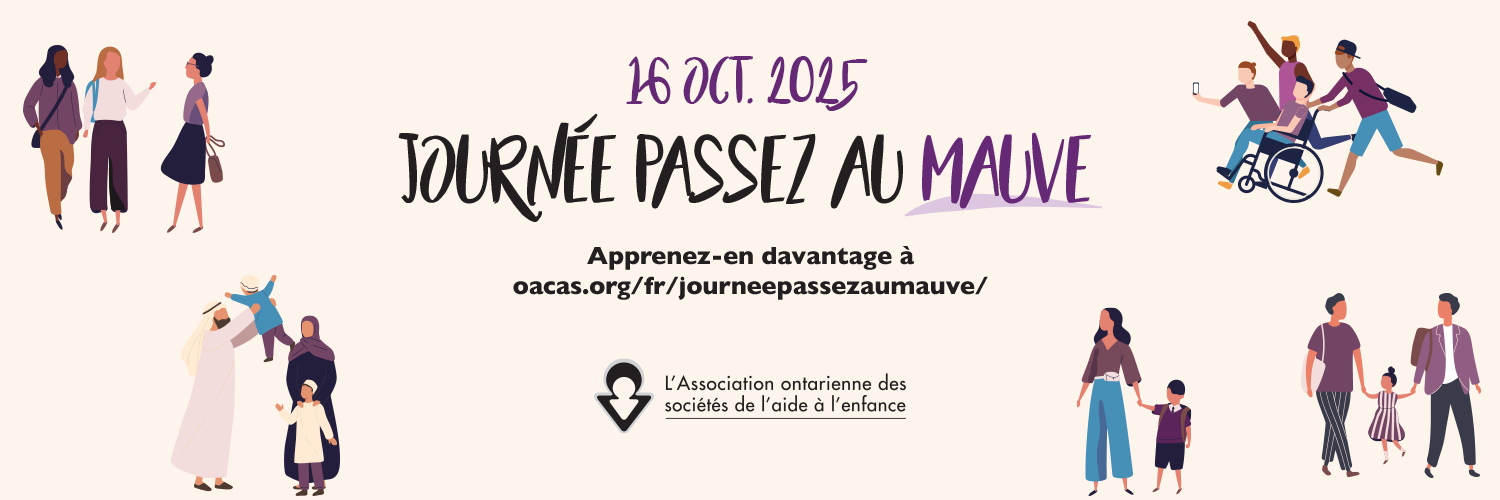 Chaque année en octobre, les sociétés d’aide à l’enfance de l’Ontario accroissent la sensibilisation au rôle important que les personnes et la communauté jouent dans le soutien aux enfants, aux jeunes et aux familles vulnérables par l’entremise de la campagne de la Journée Passez au mauve provinciale.