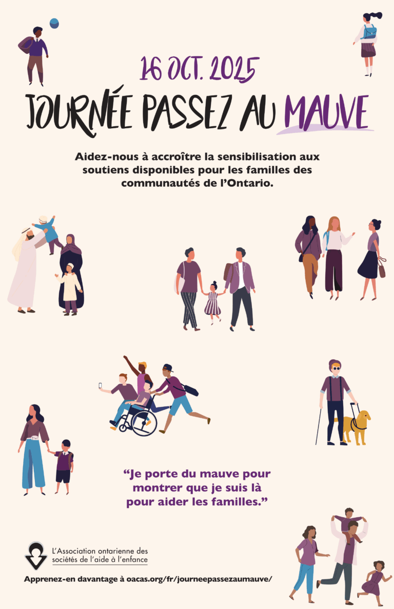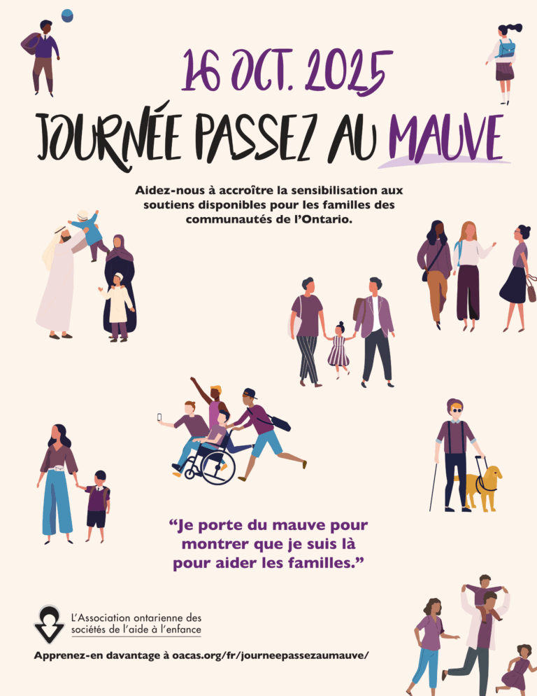 Chaque année en octobre, les sociétés d’aide à l’enfance de l’Ontario accroissent la sensibilisation au rôle important que les personnes et la communauté jouent dans le soutien aux enfants, aux jeunes et aux familles vulnérables par l’entremise de la campagne de la Journée Passez au mauve provinciale.